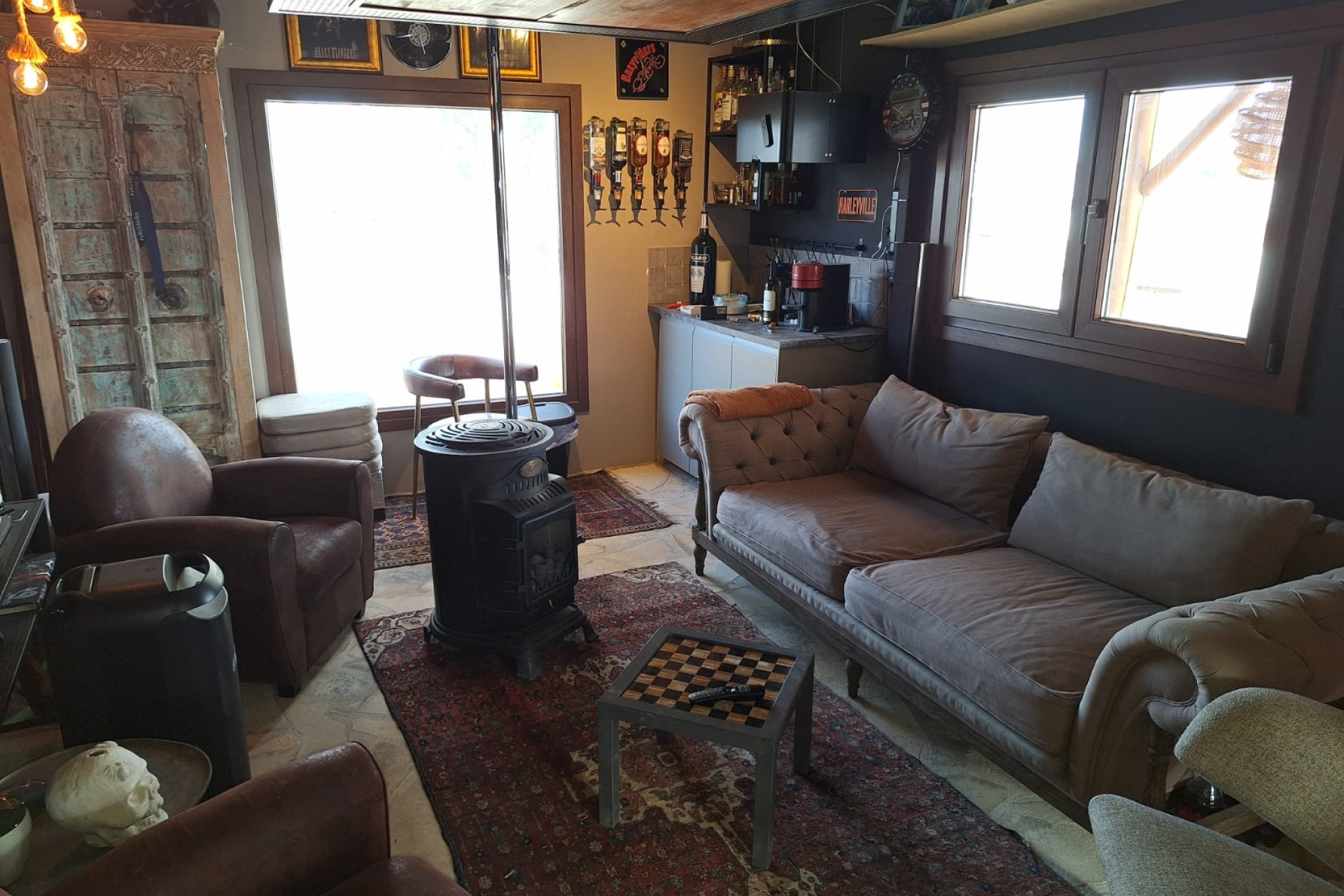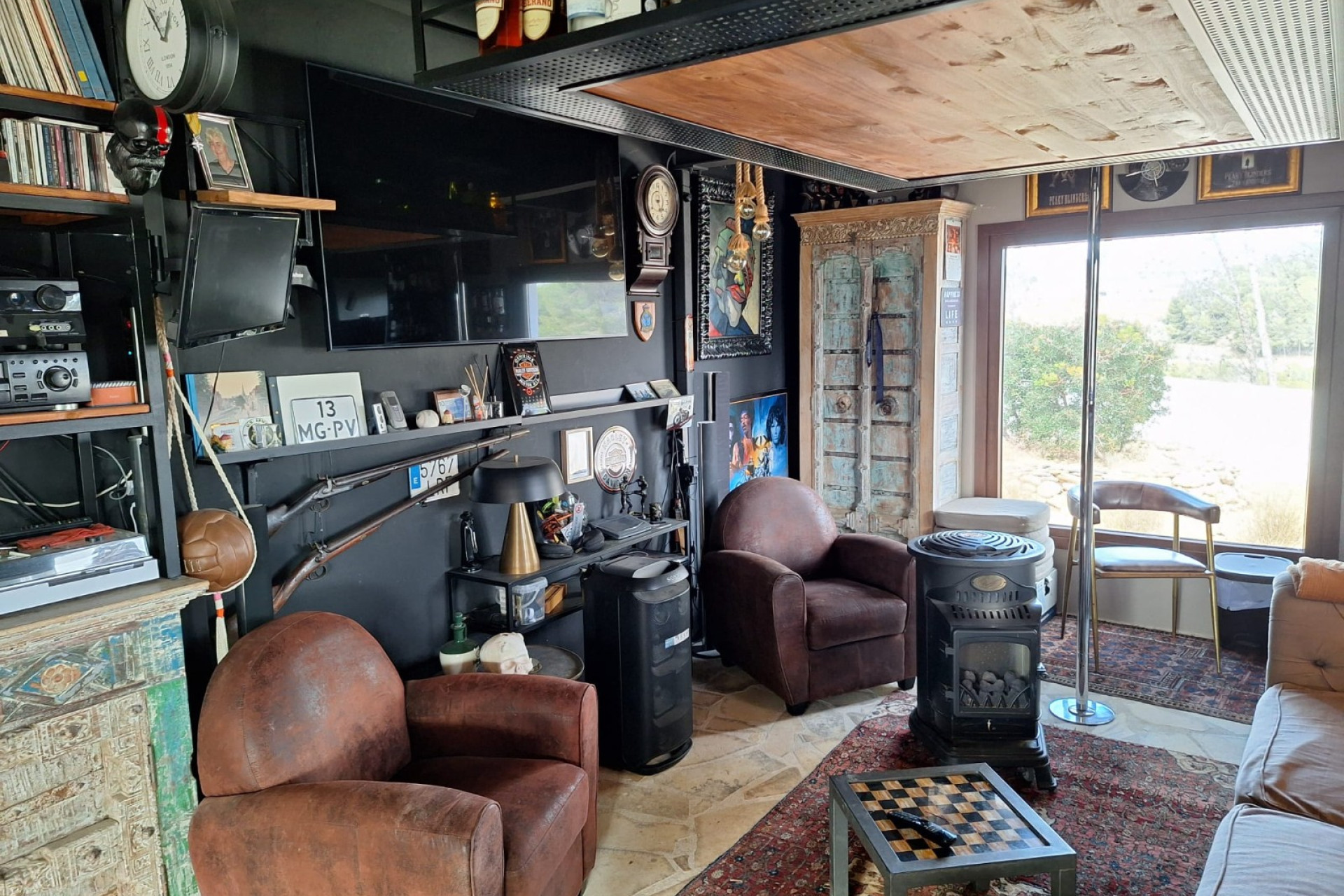 In addition to the main entrance with a pedestrian door, you can also enter the plot from the rear via a large wooden gate or the automatic gate. Here you will also find two garages, one of which is currently used as storage space and the other has been converted into an entertaining ‘man cave’. The house itself has a spacious, cosy living room with lots of light coming in through the French doors, two bedrooms and two bathrooms, one of which is en suite. The kitchen is connected to a slightly lower room, currently used as an office, and also provides access to a utility room. Adjacent to the living room is another lovely terrace with a long standing table under a pergola and a practical outdoor kitchen. The 8 x 4 m swimming pool is also surrounded by a spacious terrace with a cosy lounge area.