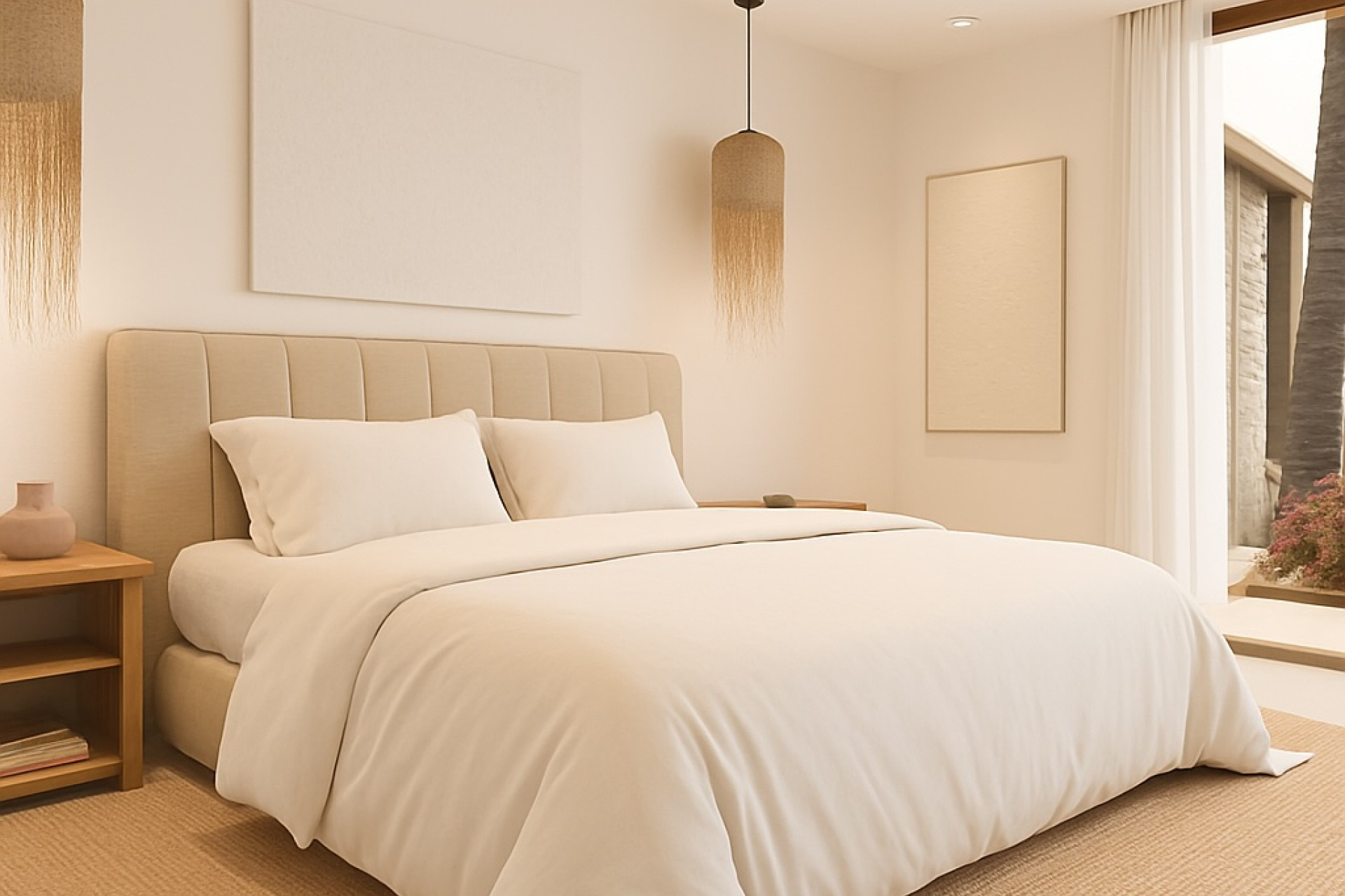 Exclusive Villa on Monte Solana – Mediterranean Lifestyle with Sea ViewsThis villa combines Mediterranean charm with modern living comfort. Spread over 200 m² of living space, it features bright, spacious rooms designed to create an open and inviting atmosphere. Seamless transitions between the living area, terrace, and private pool allow for relaxed living and stylish entertaining. The expansive outdoor areas invite you to enjoy the sun, tranquility, and stunning views of the mountains, valley, and sea. Located in a quiet, exclusive residential area of Monte Solana, the villa offers privacy, Mediterranean charm, and proximity to the coast. Shops, restaurants, and beaches are easily accessible, while the location also provides peaceful seclusion – ideal for a relaxed Ibiza-style lifestyle. Highlights Detached villa with three bedrooms and three modern bathrooms 200 m² of living space on an 800 m² plot Private pool (6 x 3 m) with mosaic tiling and a technical room beneath the terrace 40 m² sun terrace and spacious garden areas Modern, contemporary design with Mediterranean flair Panoramic views of mountains, valley, and sea Central air conditioning for heating and cooling Architecture The villa is constructed in high-quality solid build with reinforced concrete structure and meets the latest building and energy standards. Energy-efficient exterior walls with 6 cm insulation, thermally separated aluminum windows and doors in anthracite (RAL 7016), double glazing, and modern security locks ensure a comfortable living climate and top functionality. An advanced duct system distributes central air conditioning evenly throughout all rooms. Hot water is provided by an efficient electric heat pump with a large storage tank. The modern bathrooms are equipped with wall-mounted WCs, elegant sinks, and high-quality chrome or black fittings. Continuous ventilation in the kitchen and bathrooms, along with a low-voltage system, ensures a consistently pleasant indoor climate. Outdoor Areas The generous plot offers private gardens, extensive terraces with glass railings, and a pool perfect for relaxation. The pool system includes a sand filter, integrated steps, and pre-installation for pool heating. A double carport completes the overall package. The open kitchen, featuring granite countertops and custom cabinetry, integrates seamlessly with the living area, while the bathrooms with spacious showers and high-quality tiles exude modern elegance. Premium materials, clean lines, and an architecturally appealing facade highlight the exclusive character of the property.This is a home where modern design, premium finishes, and Mediterranean flair come together in perfect harmony – offering comfort, exclusivity, and a lifestyle of the highest quality.