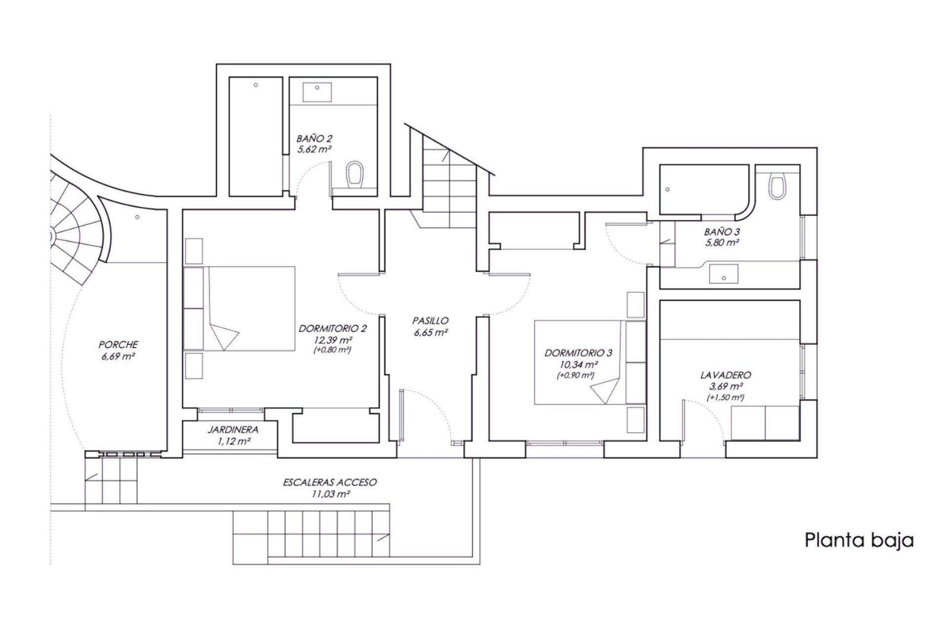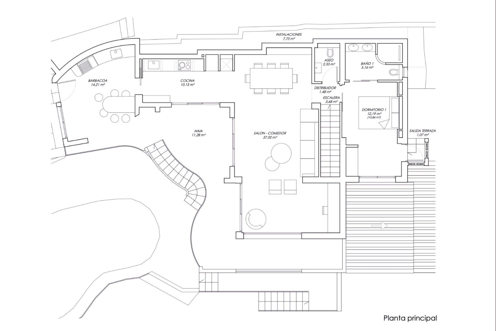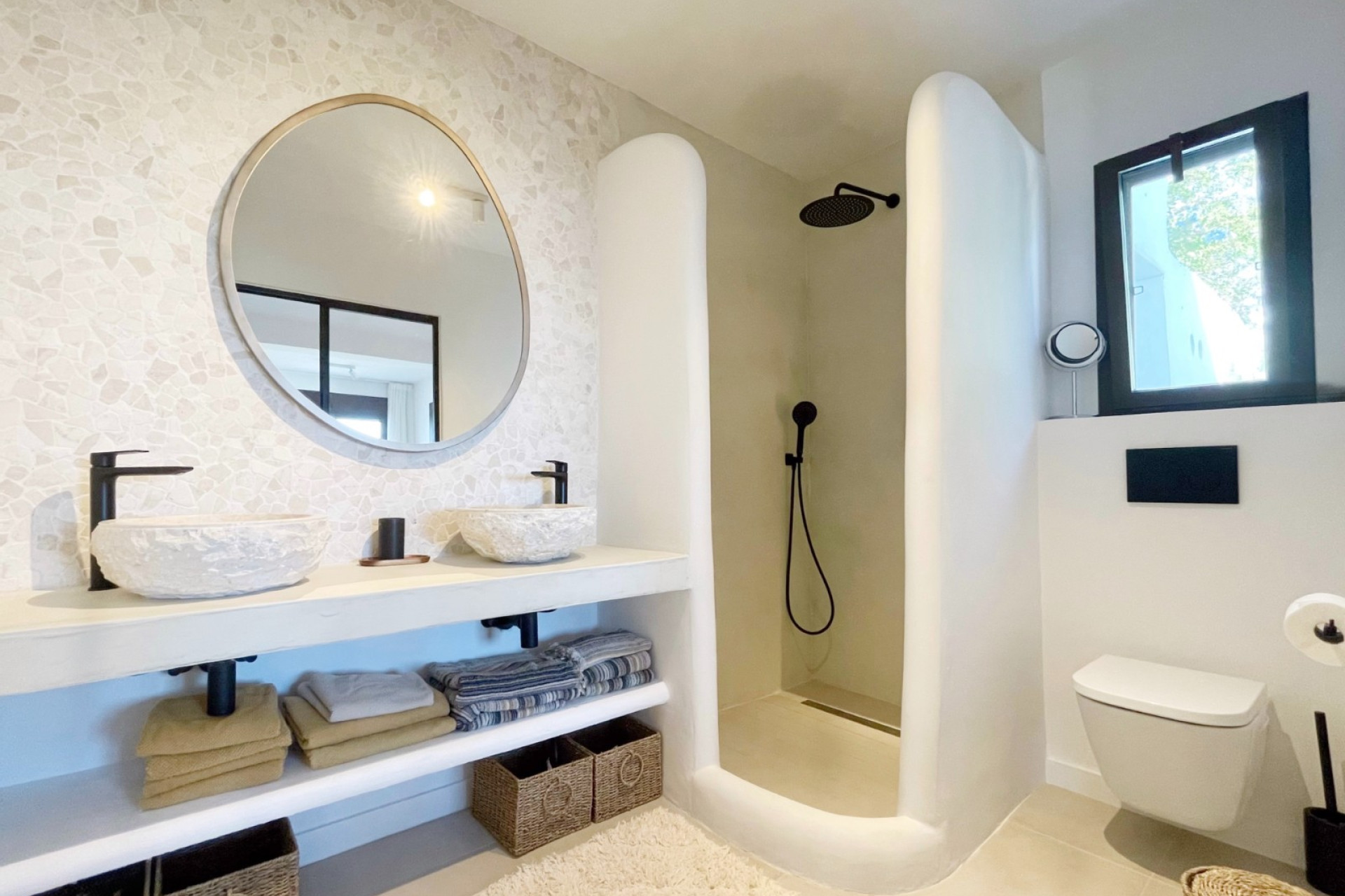 La villa cuenta con amplias y luminosas zonas de estar con grandes ventanales que permiten disfrutar al máximo de las impresionantes vistas. La zona de estar abierta conecta con una moderna cocina de estilo ibicenco, totalmente equipada con electrodomésticos empotrados y acceso directo a una cocina exterior con barbacoa. En el mismo nivel se encuentra el dormitorio principal con baño en suite y terraza privada. En la planta baja, a la que se accede por una escalera interior, hay dos dormitorios adicionales, cada uno con su propio baño, armarios empotrados con iluminación LED, aire acondicionado, persianas eléctricas, mosquiteras y vistas al mar. Además, hay un lavadero, un cuarto técnico y un trastero. La villa cuenta con varias terrazas, algunas cubiertas, una piscina en forma de riñón con ducha exterior y varias zonas de descanso. El jardín mediterráneo con una iluminación acogedora crea un ambiente agradable, tanto de día como de noche.