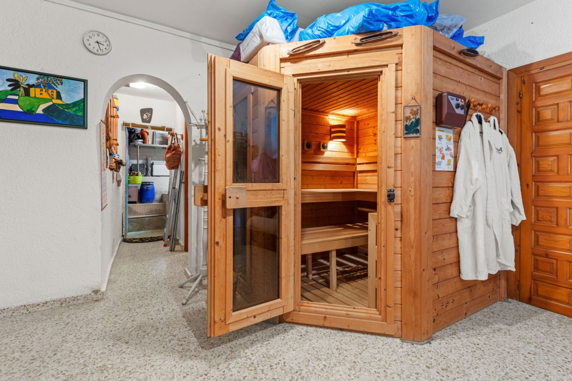 Planta baja, con entrada propia: - Un espacio versátil que actualmente alberga una sauna, pero que fácilmente puede transformarse en un apartamento de invitados, con acceso directo a una amplia terraza rodeada de vegetación y con gran privacidad. - Un baño completo. - Espacioso garaje con puerta eléctrica. - Dos trasteros. En el exterior, el jardín alberga plantas mediterráneas, incluyendo cítricos como limones, kumquat, mandarinas, pomelos y naranjas, junto a nísperos, almendros y tomates, creando un ambiente vibrante y natural.Desde la terraza cubierta delante del salón, se accede a una espaciosa terraza, perfecta para disfrutar de las vistas y la tranquilidad. Desde allí, se baja por una escalera a la zona de la piscina, la que ha sido renovada hace tan solo dos años. La piscina está equipada con una ducha exterior. Además, cuenta con una cocina de verano, perfecta para celebrar cenas al aire libre con familiares y amigos.