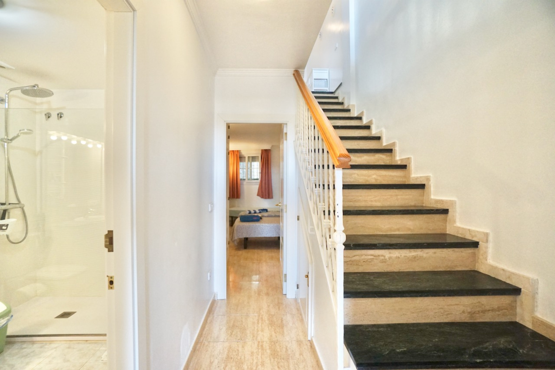 Een interne trap leidt naar de begane grond die bestaat uit een tweepersoons slaapkamer met toegang tot een eigen terras en gemeenschappelijke tuinen, een badkamer met douche en een tweede tweepersoons slaapkamer met inbouwkasten en berging.