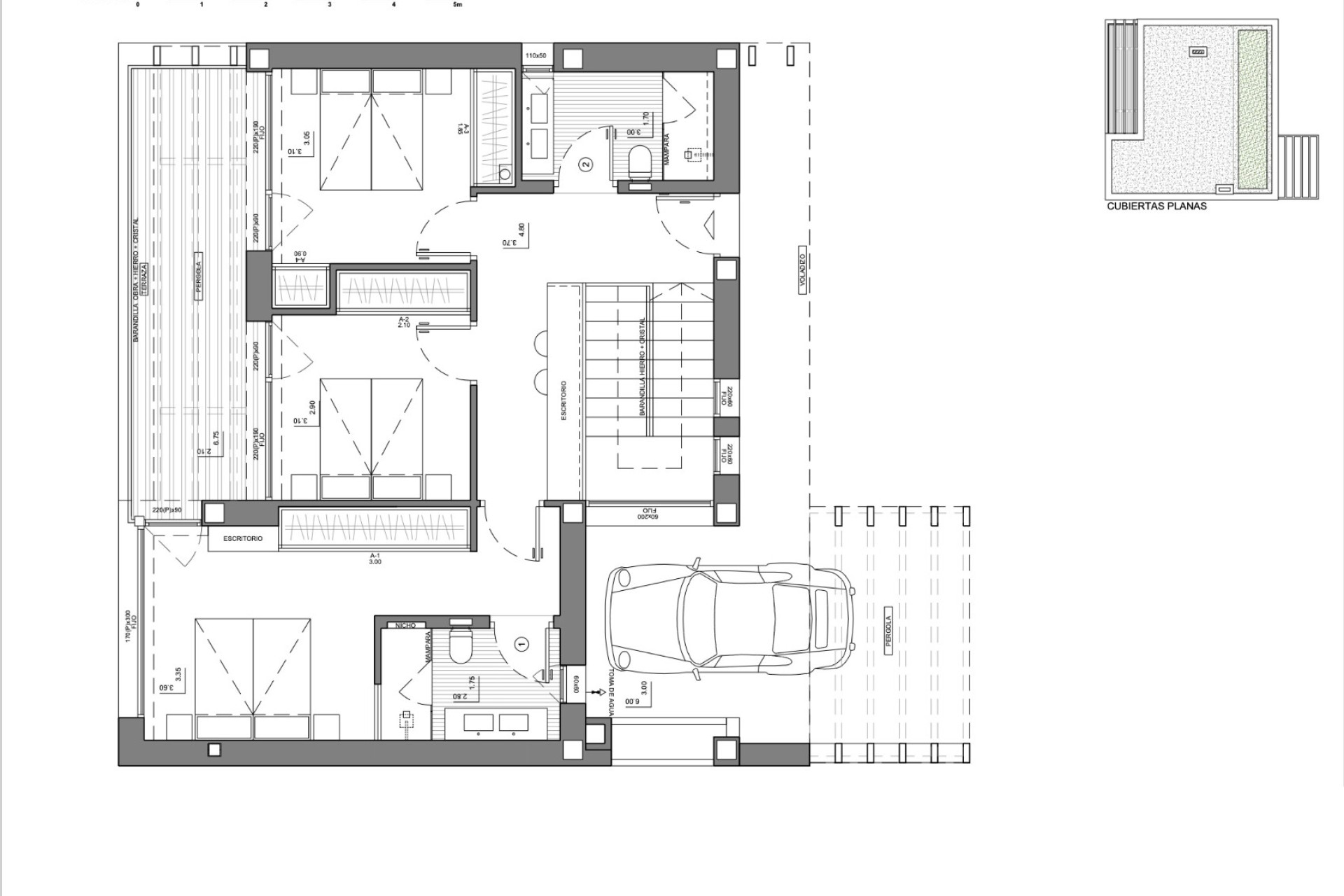 De bovenverdieping is het domein van de privacy: drie slaapkamers met privéterrassen die het uitzicht op de vallei en de Sierra del Castell d’Aixa omlijsten. De hoofdslaapkamer, met en-suite badkamer en inloopkast, wordt een plek om de dag in kalmte te beginnen en te eindigen. Dit alles gaat vergezeld van voorzieningen die welzijn en duurzaamheid waarborgen: aerothermie, vloerverwarming, fotovoltaïsche panelen, domotica en een laadpunt voor elektrische auto’s. Airen B is niet zomaar een villa; het is een uitnodiging om een nieuwe manier van leven te ontdekken, in evenwicht met de natuur, het ontwerp en jezelf.
